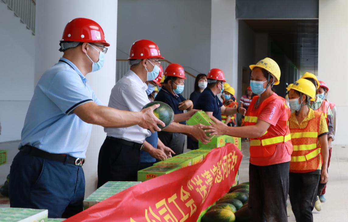 在項目現(xiàn)場,慰問組一行與項目負責人深入交流,詳細了解一線職工工生產(chǎn)生活情況,現(xiàn)場查看施工安全生產(chǎn)、勞動保護和防暑降溫措施,并送上清涼飲料等慰問品。