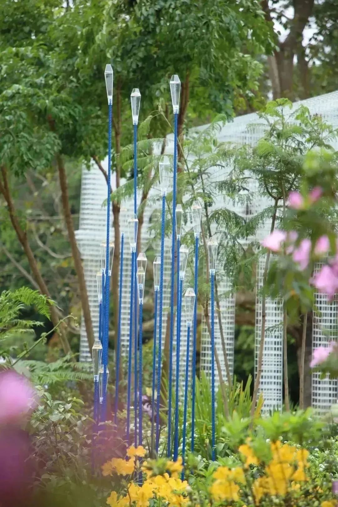 漫步在蜿蜒的小徑上,高山杜鵑、花灌木、粘葉豆等各色花卉、喬灌木植物錯(cuò)落分布著,香氣宜人。起風(fēng)時(shí),湖藍(lán)色的豎向立柱在水池中央隨風(fēng)搖擺,營造“長風(fēng)破浪會(huì)有時(shí),直掛云帆濟(jì)滄?!钡姆諊饩?,寓意粵澳合作乘風(fēng)遠(yuǎn)航,精彩紛呈。
