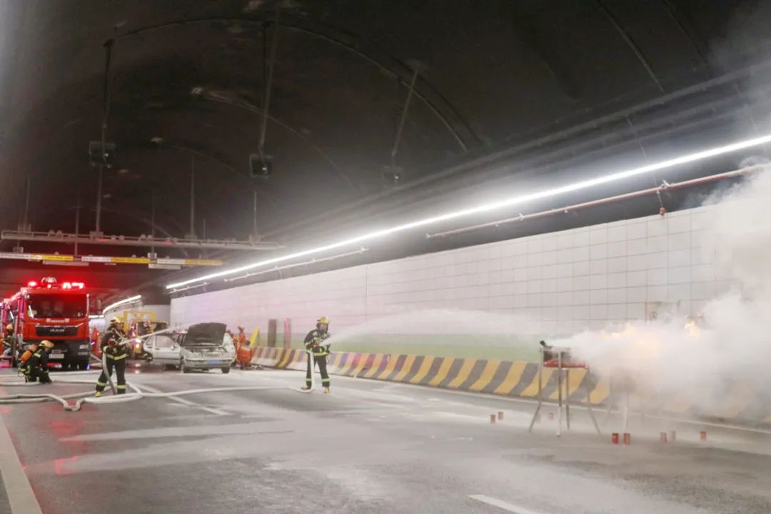 守護安全,分秒必爭。隧道運行環(huán)境錯綜復(fù)雜,推動“人治”向“智治”轉(zhuǎn)變尤為重要。本次演練增設(shè)了消防噴淋系統(tǒng)演練環(huán)節(jié),真實呈現(xiàn)系統(tǒng)自動滅火過程。隧道火焰探測器感應(yīng)到火災(zāi)后自主發(fā)出告警信息,啟動噴淋系統(tǒng)滅火,做到安全、迅速、及時。
