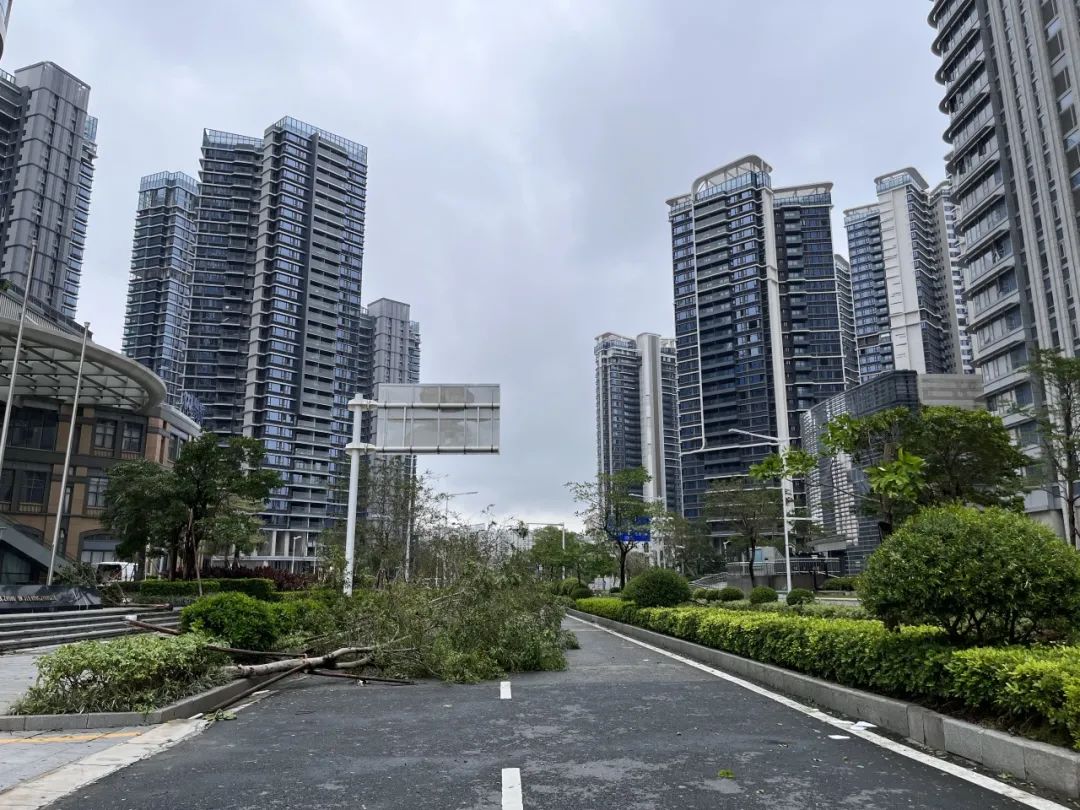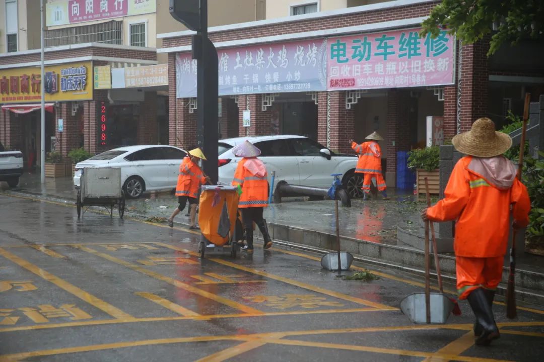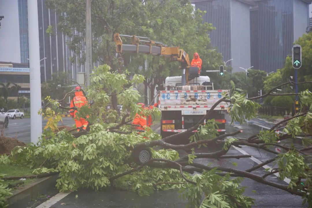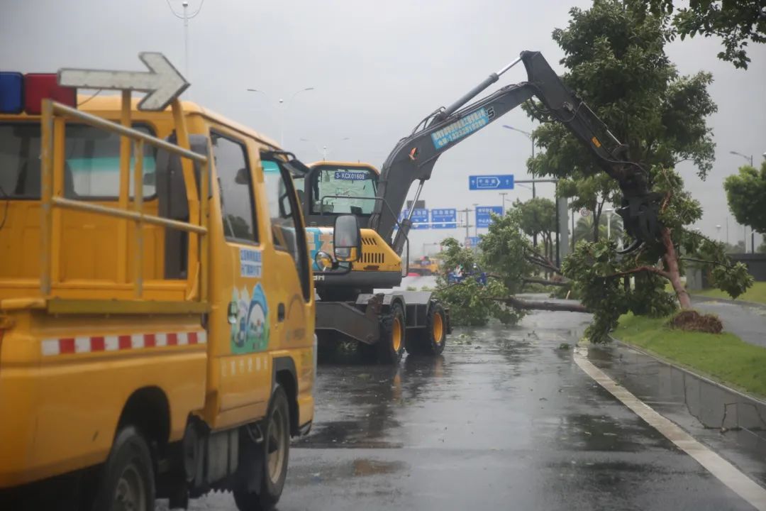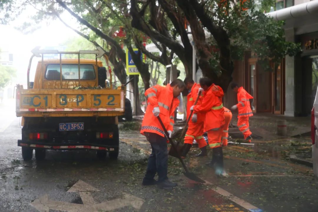 清除主路的倒伏樹木,搬運(yùn)切割下來的樹干樹枝,清掃地上的落葉和垃圾,沖洗淤泥,疏通路面積水,清理倒伏的水馬……