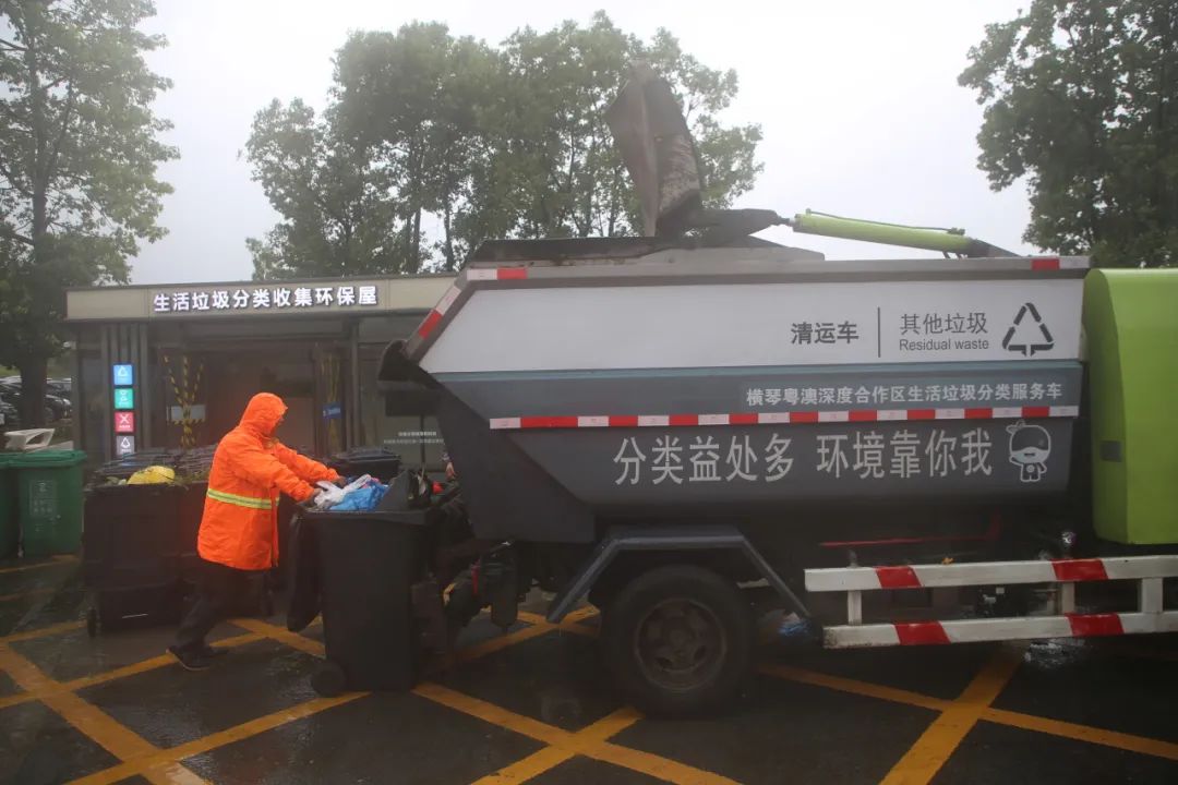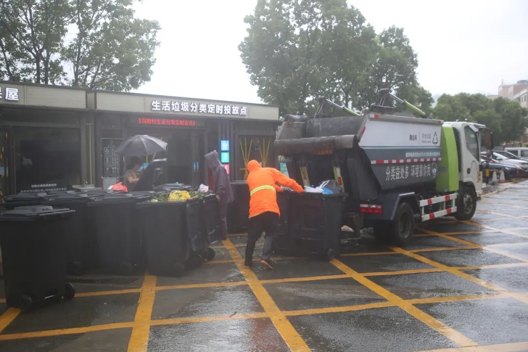 在生活垃圾投放點(diǎn),工作人員有序清理,臺(tái)風(fēng)過后產(chǎn)生的各類生活垃圾助力恢復(fù)干凈整潔的城市環(huán)境。