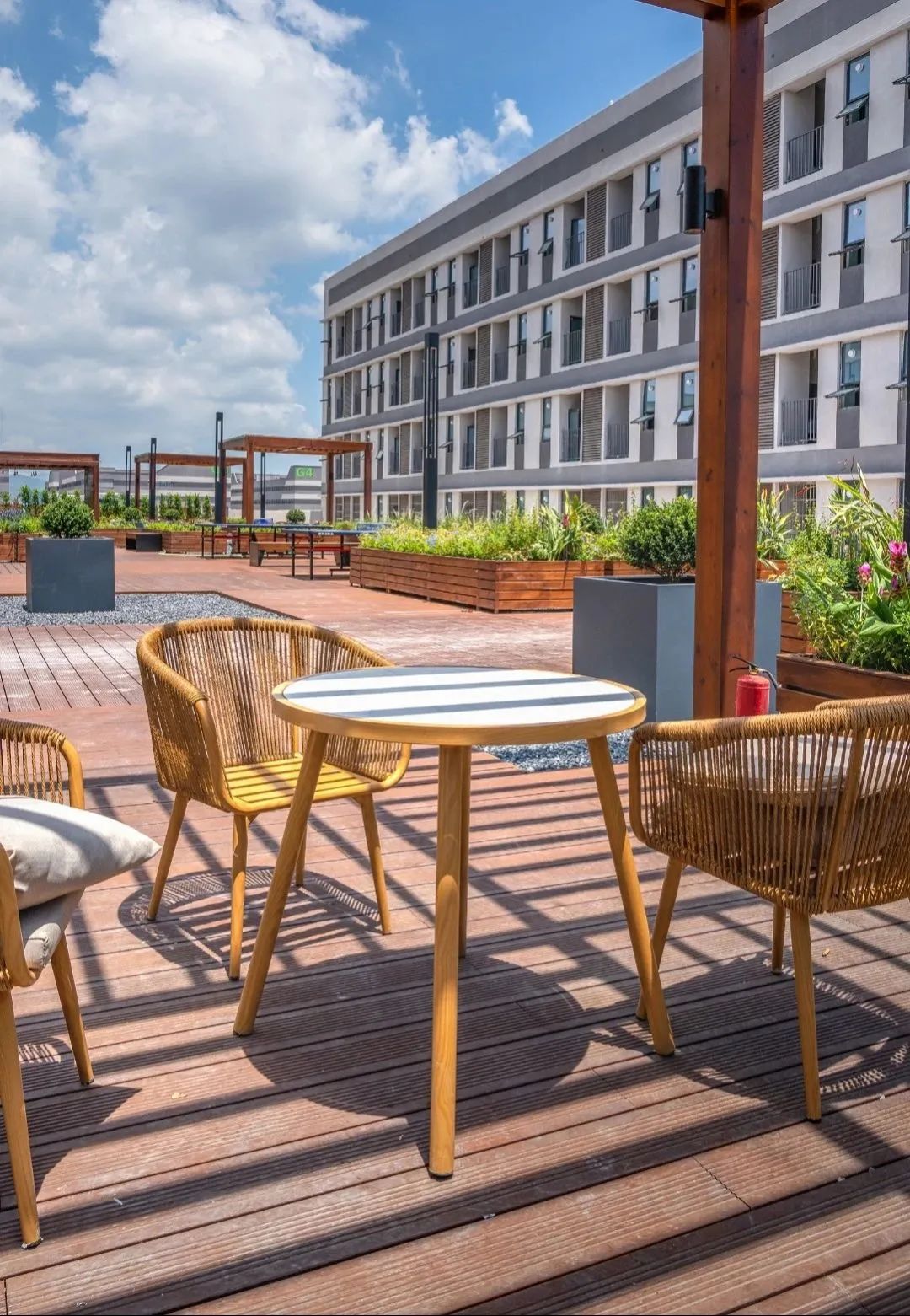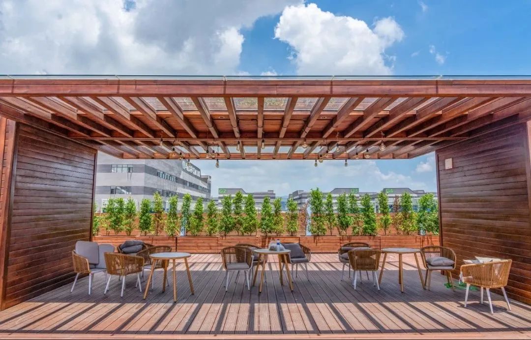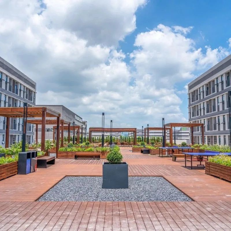 公共服務中心三層平臺設置了屋頂花園,形成半開放式創(chuàng)新社區(qū)??紤]到公共服務中心宿舍的分布,屋頂花園位于兩側宿舍動線中軸。
