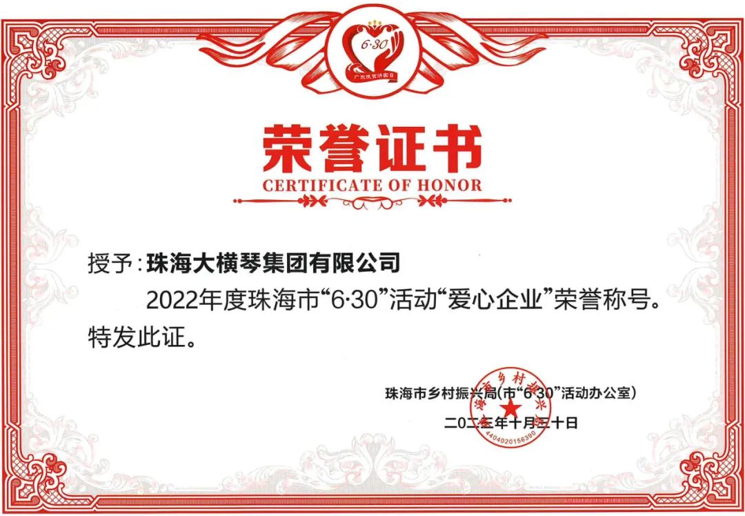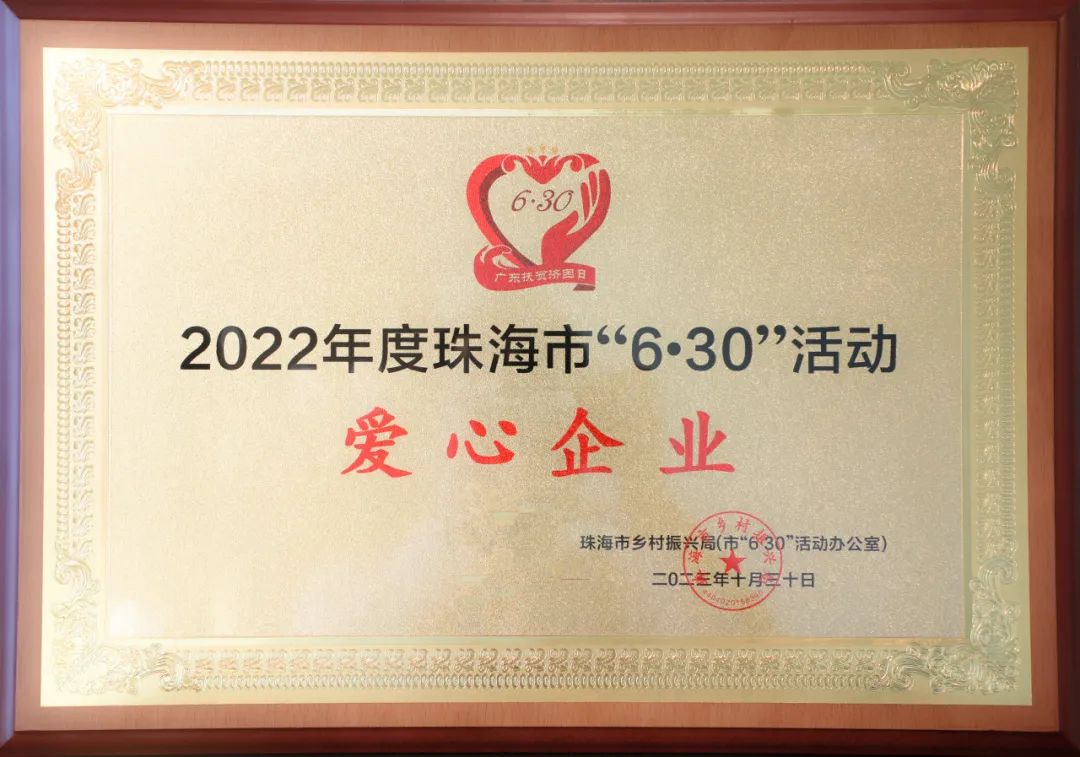 為深入貫徹黨的二十大和中央農(nóng)村工作會議精神,落實(shí)市委、市政府關(guān)于統(tǒng)籌實(shí)施鄉(xiāng)村振興戰(zhàn)略和“百縣千鎮(zhèn)萬村高質(zhì)量發(fā)展工程”工作部署,匯聚更多社會力量參與“6·30”活動,鞏固脫貧成果、助力鄉(xiāng)村振興、促進(jìn)共同富裕,根據(jù)《中共珠海市委農(nóng)村工作領(lǐng)導(dǎo)小組〈關(guān)于印發(fā)珠海市2023年“6·30”助力鄉(xiāng)村振興活動工作方案〉的通知》(珠委農(nóng)組〔2023〕6號)精神,市鄉(xiāng)村振興局(市6·30活動辦)開展2022年度珠海市“6·30”活動“愛心企業(yè)、愛心團(tuán)體、愛心個人”評選活動,向社會傳遞珠海人民樂善好施的精神品德,激發(fā)社會各界共襄善舉、助力鄉(xiāng)村振興。經(jīng)評審,珠海大橫琴集團(tuán)有限公司(以下簡稱大橫琴集團(tuán))被授予2022年度珠海市“6·30”活動“愛心企業(yè)”榮譽(yù)稱號。