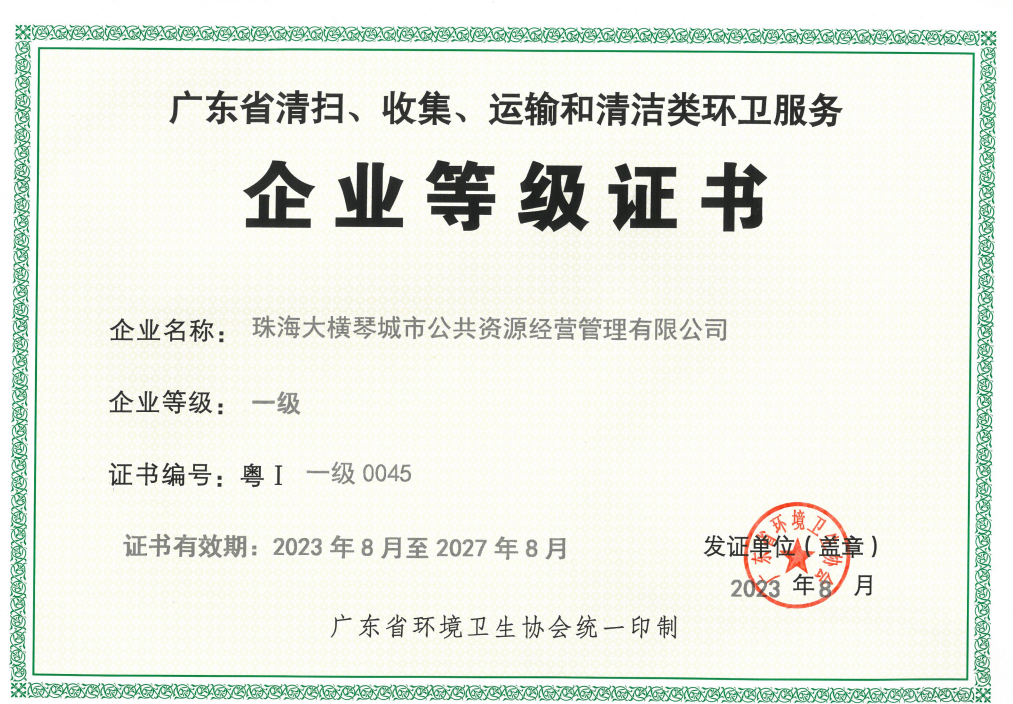 2023年,大橫琴城資榮獲“廣東省清掃、收集、運輸和清潔類環(huán)衛(wèi)服務(wù)企業(yè)”一級評定和珠海市“十佳環(huán)衛(wèi)(垃圾分類)企業(yè)”稱號。