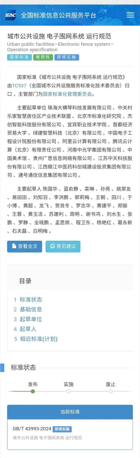 GB/T 43993-2024《城市公共設(shè)施 電子圍網(wǎng)系統(tǒng) 運行規(guī)范》于2021年12月立項,由大橫琴科技公司主導(dǎo)制定,TC537全國城市設(shè)施服務(wù)標準化技術(shù)委員會提供指導(dǎo)。標準制定工作組經(jīng)過深度場景調(diào)研、密集專題討論、廣泛征求意見、嚴格技術(shù)審查,歷經(jīng)兩年研制周期,最終確立了電子圍網(wǎng)系統(tǒng)運行架構(gòu),明確了運行總體原則,并對電子圍網(wǎng)系統(tǒng)的運行資源、運行服務(wù)、運行評價改進進行了全面規(guī)范化。該標準于2024年4月25日正式發(fā)布,并于2024年11月1日起正式實施。