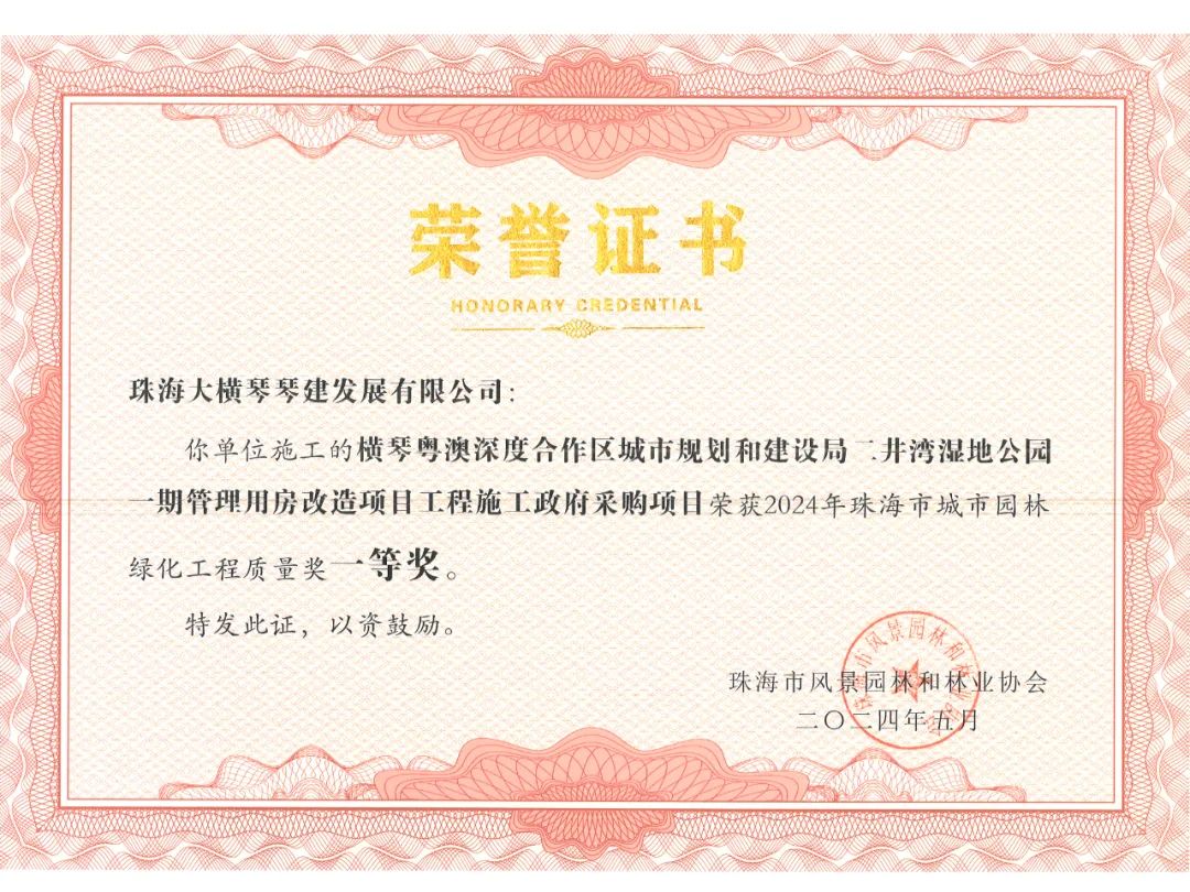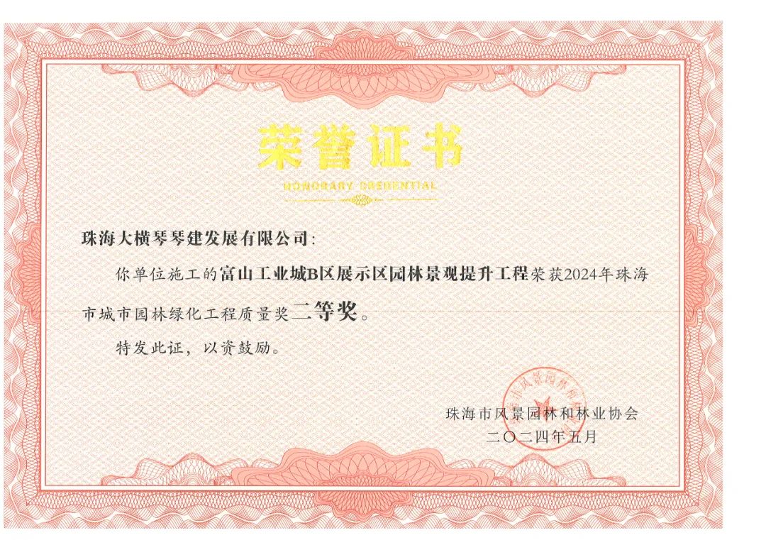 橫琴粵澳深度合作區(qū)城市規(guī)劃和建設(shè)局市政管理署2023年專類公園綜合管養(yǎng)政府采購項(xiàng)目、橫琴粵澳深度合作區(qū)城市規(guī)劃和建設(shè)局二井灣濕地公園一期管理用房改造項(xiàng)目工程施工政府采購項(xiàng)目,榮獲2024年珠海市城市園林綠化工程質(zhì)量獎一等獎!富山工業(yè)城B區(qū)展示區(qū)園林景觀提升工程,榮獲2024年珠海市城市園林綠化工程質(zhì)量獎二等獎!