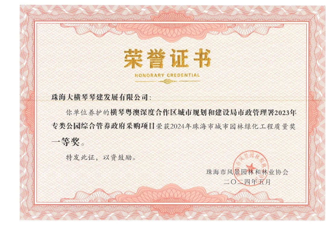 近日,珠海大橫琴集團(tuán)有限公司(以下簡稱大橫琴集團(tuán))下屬企業(yè)珠海大橫琴琴建發(fā)展有限公司所負(fù)責(zé)的生態(tài)養(yǎng)護(hù)與景觀建改項(xiàng)目接連獲得由珠海市風(fēng)景園林和林業(yè)協(xié)會頒發(fā)的多個獎項(xiàng)。