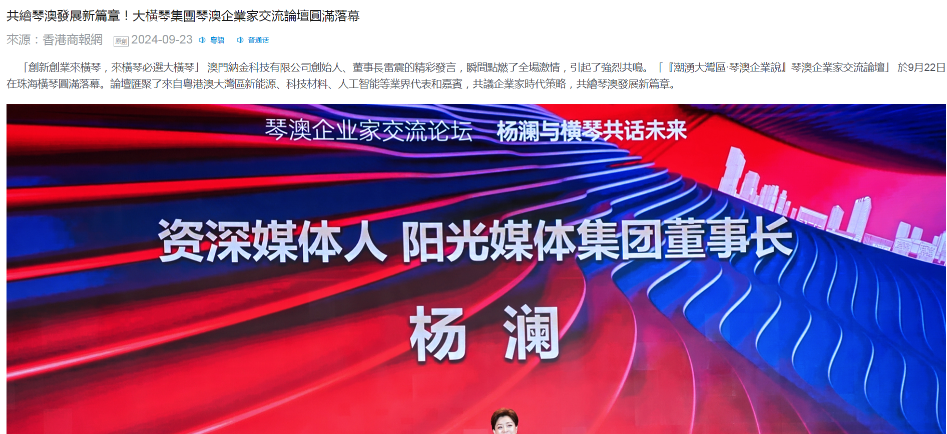 此次論壇由橫琴粵澳深度合作區(qū)(以下簡(jiǎn)稱:合作區(qū))經(jīng)濟(jì)發(fā)展局支持,大橫琴集團(tuán)、叡智蓮花公關(guān)服務(wù)有限公司聯(lián)合主辦,是繼「潮湧大灣區(qū)·澳門青年說」論壇後,大橫琴集團(tuán)再次攜手資深媒體人、陽光媒體集團(tuán)董事長(zhǎng)楊瀾女士,匯聚來自粵港澳大灣區(qū)新能源、科技材料、人工智能等各行各業(yè)共500多位代表和嘉賓,共議企業(yè)家時(shí)代策略,共繪琴澳發(fā)展新篇章。