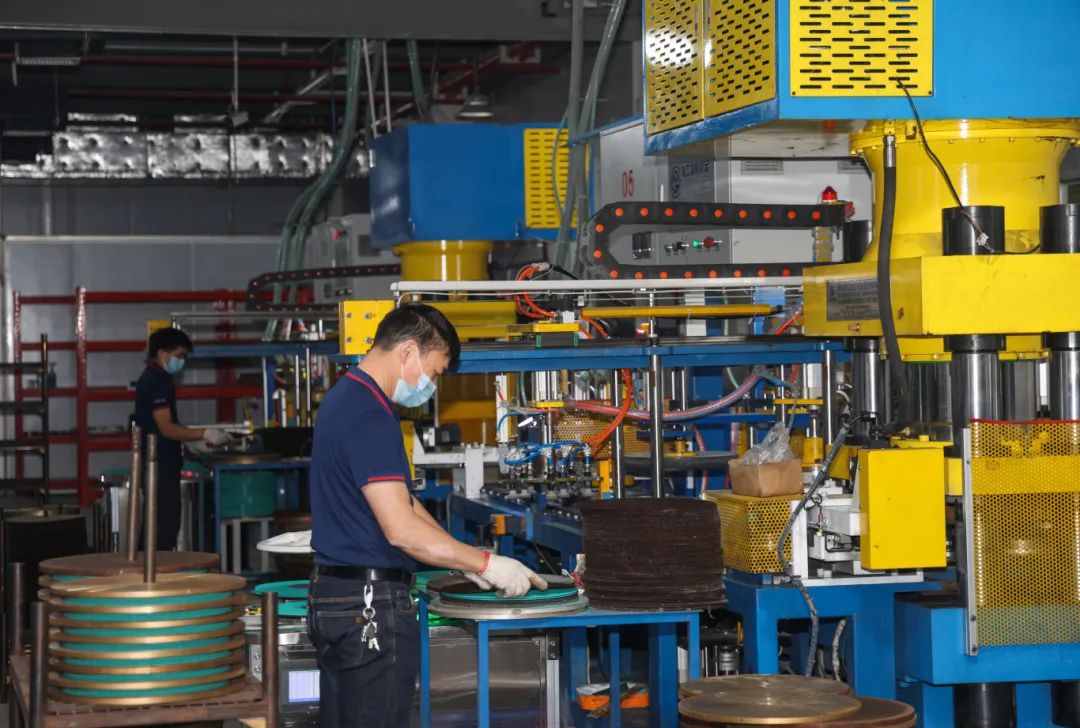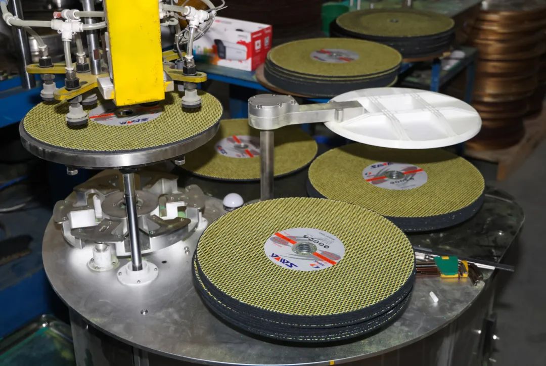 步入車間,智能化設(shè)備高效運轉(zhuǎn),厚度1至6毫米的砂輪經(jīng)過精密加工后整齊排列,即將發(fā)往全球市場。