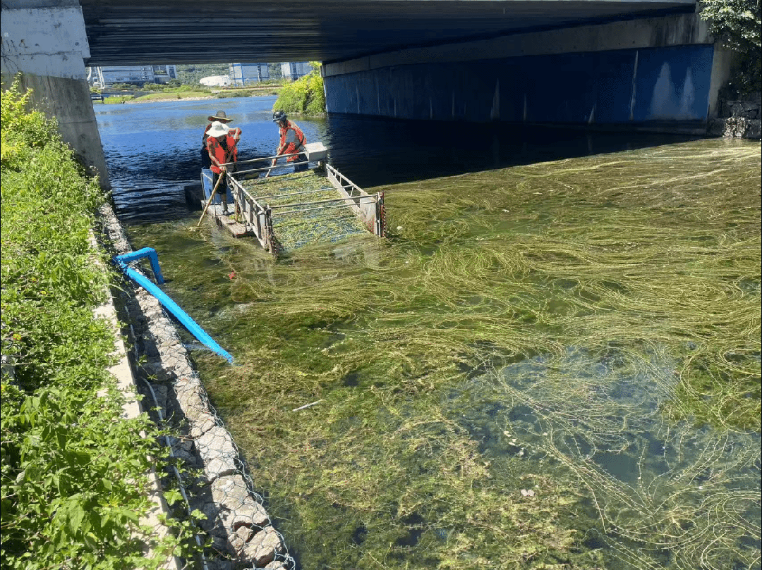 針對不同區(qū)域的水草特點,精準(zhǔn)施策:大面積區(qū)域用機(jī)械打撈船快速收割;淺灘水草由專人下水割草;零散水草由保潔船只人工打撈;水面漂浮的斷根水草及浮萍,則利用攔污排攔截,防止擴(kuò)散。
