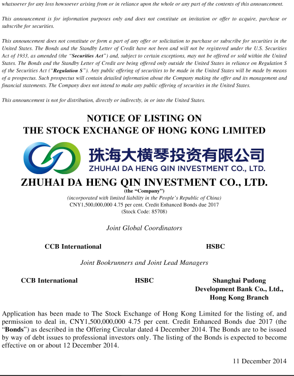 大橫琴投資有限公司債券于 香 港 聯(lián) 合 交 易 所 有 限 公 司 上 市 之 通 知